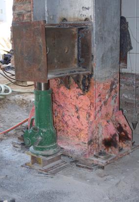 由于礦井凍結(jié)法施工造成后期井口附房產(chǎn)生較大沉降,影響了上部結(jié)構(gòu)的使用。采用頂升法對鋼結(jié)構(gòu)廠房中的沉降較大的鋼柱進行糾偏,該方面需要在鋼柱腹板上焊接鋼牛腿提供頂升支點,同時對鋼柱底部預(yù)埋的螺栓桿體加長,每個鋼柱兩側(cè)設(shè)置兩個頂升千斤頂,經(jīng)過頂升糾偏后該鋼結(jié)構(gòu)廠房基本恢復(fù)原狀
