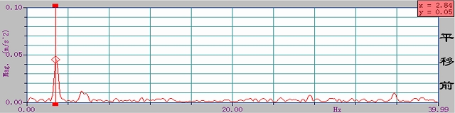 平移前的測試結(jié)果:根據(jù)實(shí)測的實(shí)時(shí)譜曲線,平移前二層樓面振動(dòng)測點(diǎn)的主頻為2.84HZ(振動(dòng)周期0.35s)。
