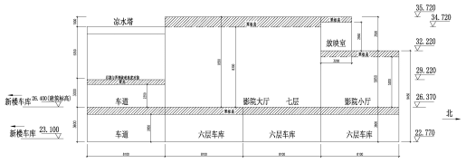 根據經營要求,建筑物東側單體需進行加層改造,加層后,原五層頂屋面變為六層,作為車庫或經營使用,原五層新世紀影城搬遷至新建七層。加層設計時,結構標高布置需在滿足影廳凈高要求的同時兼顧新加樓層與周邊建筑物車道的交通銜接、屋頂涼水塔、影院放映廳、已有樓梯、電梯等,平面、剖面布置較為復雜,剖面見圖2。