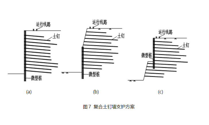 (3)方案三:考慮到以上方案的優缺點,我單位提出基坑上部采用微型樁+土釘錨桿的擋土墻形式,下部采用傳統土釘墻形式(圖3c),該方案得到建設單位和監理單位的認可,并獲得實施。該方案