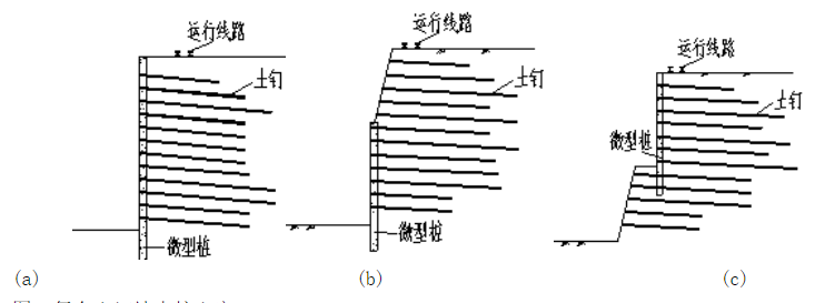 考慮到工程場地周邊條件(南側緊靠運行線路)和地質條件(上部填土較厚),考慮到工程對安全、工期和經濟的要求,綜合考慮決定采用微型樁+土釘錨桿的復合土釘墻支護方案。這種形式的復合土釘墻有三種類型,不同工程技術人員對不同方案表達了支持意見,現分述如下: