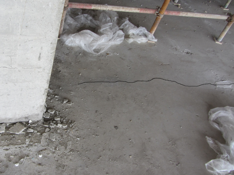 主體結構現已封頂,在2014年元旦左右,拆除E區一二層頂BDF大板模板后,發現一層~三層頂大板四周柱與相關梁出現不同程度的裂縫,隨之二層頂BDF大板也出現板底裂縫。