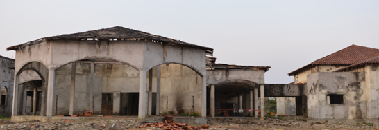 伊豐度總統(tǒng)行宮項(xiàng)目為2006年剛果(布)國(guó)慶配套工程,占地101200m2,由一個(gè)主樓加上兩個(gè)單層別墅組成。其中1#主樓建筑面積為2700 m2,主體為一層、局部二層,一層層高約為5米,大廳處層高約為8米,結(jié)構(gòu)形式為混凝土柱、梁及150厚空心砌塊墻承重,木屋頂結(jié)構(gòu)(局部現(xiàn)澆板屋頂),見圖32~35。現(xiàn)大部分圖紙缺失,混凝土強(qiáng)度等級(jí)、砌體材料強(qiáng)度等級(jí)不詳。該國(guó)建筑物不考慮抗震設(shè)防要求。2006年由本地建筑單位承建,由于各種原因中途停工至今,現(xiàn)剛果(布)大工委指派威海國(guó)際經(jīng)濟(jì)技術(shù)合作股份有限公司進(jìn)行維修與續(xù)建,項(xiàng)目組對(duì)現(xiàn)狀進(jìn)行勘察后發(fā)現(xiàn)該工程施工質(zhì)量差,且長(zhǎng)時(shí)間暴曬雨淋導(dǎo)致屋架腐爛、梁柱板鋼筋嚴(yán)重銹蝕,存在重大安全隱患,為保證結(jié)構(gòu)安全,委托我所對(duì)該工程進(jìn)行鑒定并出具加固方案。